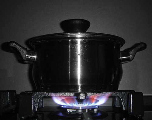 The water at the bottom of the pot gets hot and then moves to the top of the pot because of convection. This allows the cold water to sink to the bottom and heat up. This constant circulation allows all of the water to heat up and boil.