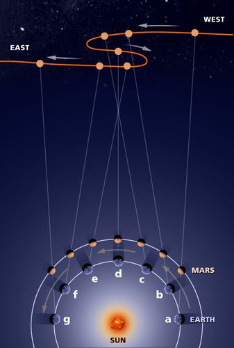 The Earth moves faster than Mars in its orbit and catches up with Mars at point (b) before overtaking Mars at point (d). As the Earth overtakes Mars, Mars appears to travel backwards on the sky, even though Mars is not really changing direction in space.