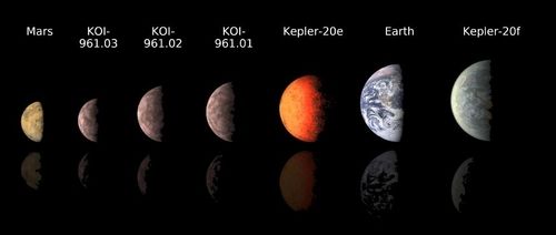This image compares the smallest known exoplanets orbiting outside the solar system, to our own planets Mars and Earth.