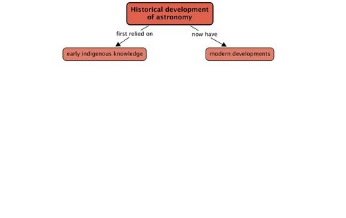 Throughout this year we have been looking at how to produce concept maps after each chapter. This is now your chance to make your own concept map. The concepts in this chapter about the development of astronomy can easily be divided into two main themes. Firstly, about "early indigenous knowledge" and then about the "modern developments" that people have made and are still making. The concept map has been started for you. Copy this into your notebook to first practice drawing your concept map. Once you have your final version, with the help of your teacher, draw it into the space below to act as the summary for this chapter.