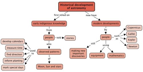 A version of a completed concept map is provided for you to reference when going through the process with your learners. Encourage them to first design their own concept maps on some scrap paper or in their notebooks. You will need to walk around the class during this time to help them and lead them through the process. For example, for the development of "early indigenous knowledge", ask questions such as: