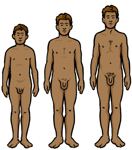 The penis grows longer and slightly wider; it begins to ejaculate preparing for reproduction. The testes mature and start to produce sperm which can fertilise an egg.
