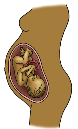 The period (approximately 40 weeks) from conception to birth, where the foetus develops in the womb or uterus. |