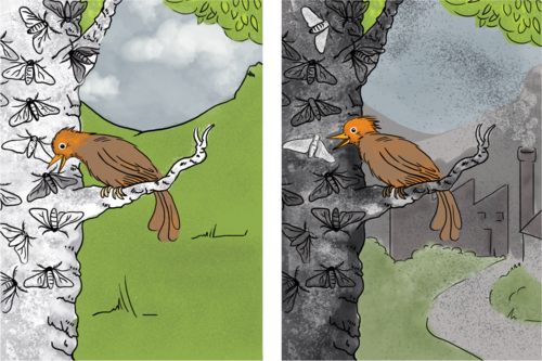 The light coloured moths were therefore not camouflaged anymore and could be seen easily by predators when they rested on the trees. As a result, more of the light-coloured moths were eaten by birds and didn't have a chance to mate and lay eggs. Therefore the number of light-coloured moths decreased. In comparison, the few moths that were a dark grey colour were now at an advantage as they were now the same colour as the soot covered trees and could hide. These darker-coloured moths could therefore go on to have more offspring. Over time, this resulted in more and more of the moths being dark-coloured.