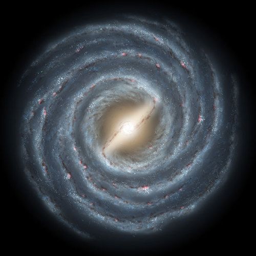 If you could travel outside the Milky Way and look down on it from above, the galaxy would look like a giant spiral in space as shown in the following image.