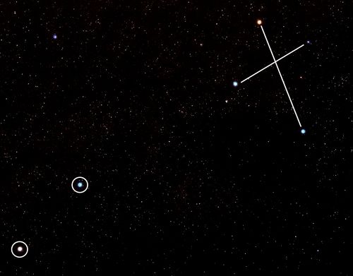 The brightest of the Pointers looks slightly orange if you look closely. This star is called Alpha Centauri and is our closest easily visible star after the Sun. Alpha Centauri is actually part of a triple star system which is where three stars are in orbit around each other. The two main stars of the system are called Alpha Centauri A and Alpha Centauri B. They orbit close together, on average about eleven times the Earth-Sun distance from each other.