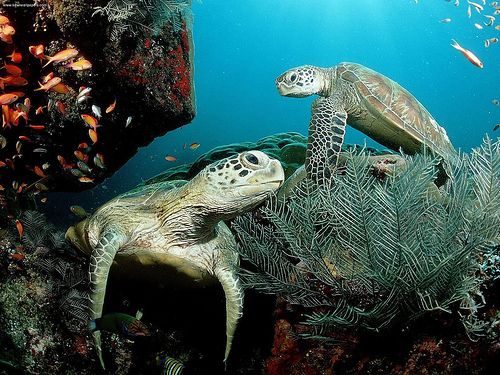 Different fish populations, turtles, seaweed, corals, sponges, plankton.