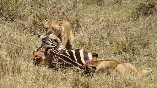 Lions, wildebeest, zebra, impala and vulture.