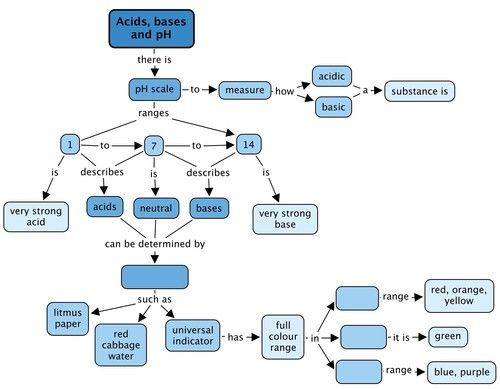 What can you use to determine whether a substance is an acid, base or neutral? Fill this in on the concept map. Finally, complete it by completing the information for the universal indicator. Fill in acid, base or neutral, depending on the colours listed.