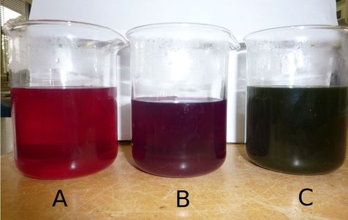 Three beakers with solutions and red cabbage water.http://www.flickr.com/photos/brittgow/4782591644/