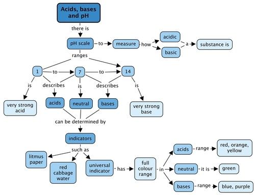 What can you use to determine whether a substance is an acid, base or neutral? Fill this in on the concept map. Finally, complete it by completing the information for the universal indicator. Fill in acid, base or neutral, depending on the colours listed.