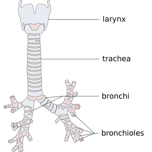 This image shows how the larynx joins the trachea which branches into the bronchi within the lungs.