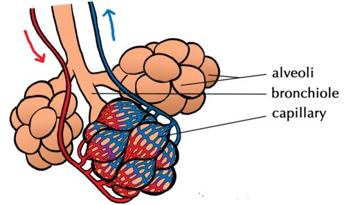 This is showing a bronchiole and alveoli. This is evident as there is one main tube which is the bronchiole. There are several alveoli present, which are the sac-like structures within the lungs. You can also see that these are tiny sacs as in the bottom left, the sacs have been shown as open. You can also see the network of capillaries which surround the alveoli bringing deoxygenated blood to the lungs to become oxygenated.