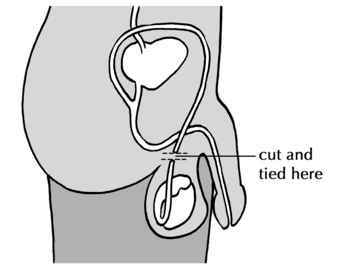 A surgical procedure in males in which the vas deferens is cut and tied. Sperm are therefore prevented from becoming part of the ejaculate. |