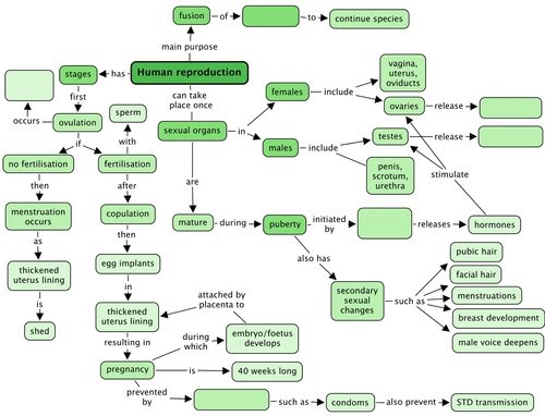 This concept map shows all that we have learned about reproduction in humans. Complete it by filling in the blank spaces. You might find this quite tricky, but you need to learn to "read" a concept map by constructing sentences. For example, "Human reproduction can take place once sexual organs are mature. They mature during puberty which is initiated by ….............. The …............ releases hormones which stimulate the ovaries and testes." What is this gland which initiates puberty and releases hormones, and which hormones do the ovaries and testes release? Fill this in below.