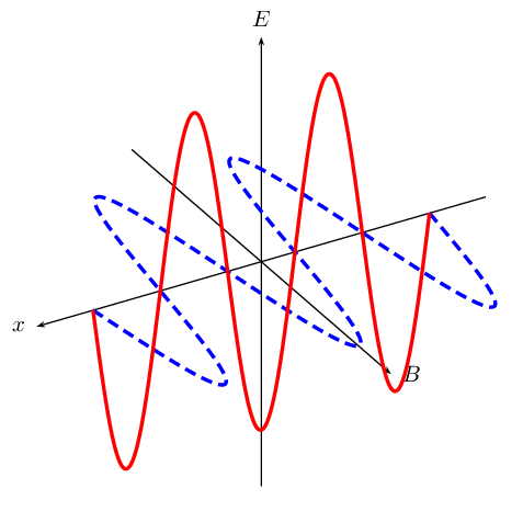 Figure 11.1: A diagram showing the mutually regenerating electric field (red (solid) line) and magnetic field (blue (dashed) line).