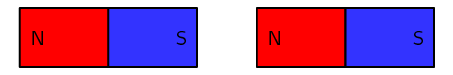 Because the domains in a permanent magnet all line up in a particular direction, the magnet has a pair of opposite poles, called north (usually shortened to N) and south (usually shortened to S). Even if the magnet is cut into tiny pieces, each piece will still have both a N and a S pole. These magnetic poles always occur in pairs. In nature, we never find a north magnetic pole or south magnetic pole on its own.