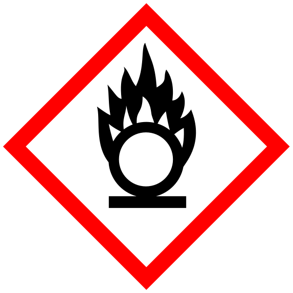 Oxidising. Chemicals with this label are able to oxidise other substances. An example is hydrogen peroxide. |