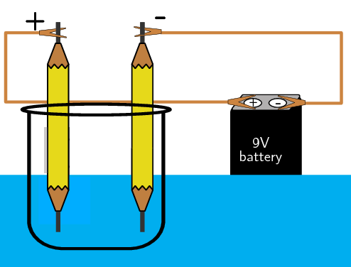You should observe bubbles forming at the tips of the pencils. Oxygen gas is formed at the positive side and hydrogen at the negative side.