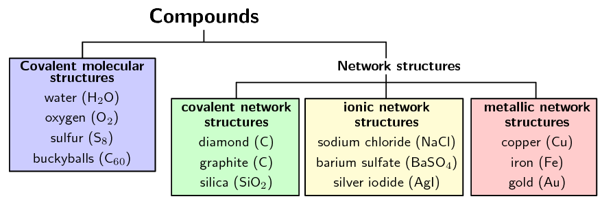 The following diagram illustrates how compounds can be subdivided by the type of bonding and the structure: