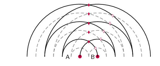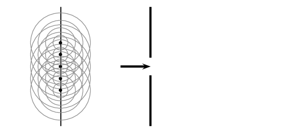 Each point source emits wavefronts from the edge of the slit. In the diagram we show a series of wavefronts emitted from each point source. The black lines show peaks in the waves emitted by the point sources and the gray lines represent troughs. We label the places where constructive interference (peak meets a peak or trough meets a trough) takes place with a solid diamond and places where destructive interference (trough meets a peak) takes place with a hollow diamond. When the wavefronts hit a barrier there will be places on the barrier where constructive interference takes place and places where destructive interference happens.