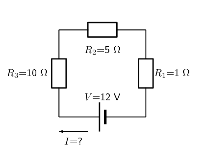 \begin{align*} I & = \frac{V}{R} \\ & = \frac{9}{5} \\ & = \text{1,8}\text{ A} \end{align*}Three resistors with resistance \(\text{1}\) \(\text{Ω}\), \(\text{5}\) \(\text{Ω}\) and \(\text{10}\) \(\text{Ω}\) respectively, are connected in series with a \(\text{12}\) \(\text{V}\) battery. Calculate the value of the current in the circuit.