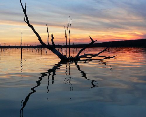 bounces off a surface. In the following figure, a still lake reflects the landscape