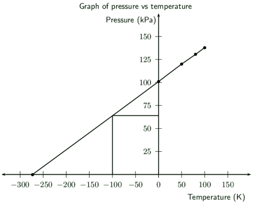 If the gradient of the above graph is measured to be \(\text{0,008}\) \(\text{m$^{3}$·K$^{-1}$}\), calculate the pressure that \(\text{0,3}\) \(\text{mol}\) of this gas would exert.