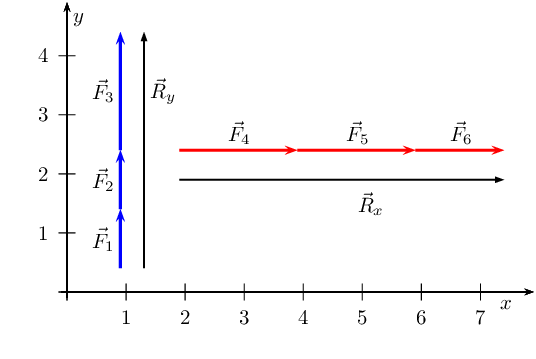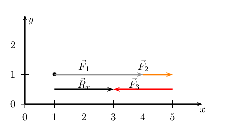 the \(x\)-direction. The two black vectors represent the resultants of the co-linear