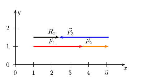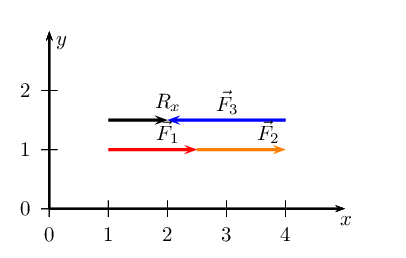 - \(\vec{F}_{3} = \text{2}\text{ N}\) in the negative \(x\)-direction