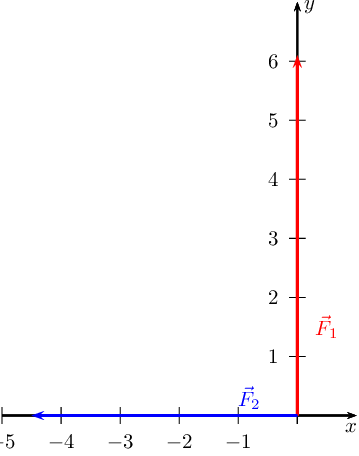 - \(\vec{F}_{2} = \text{6}\text{ N}\) in the positive \(x\)-direction