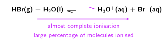The value of \(\text{K}_{\text{a}}\) for this reaction is very high (approximately \(\text{1} \times \text{10}^{\text{9}}\)). This means that there are many more moles of product than reactant. The \(\text{HBr}\) molecules are almost all ionised to \(\text{H}^{+}\) and \(\text{Br}^{-}\).