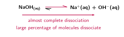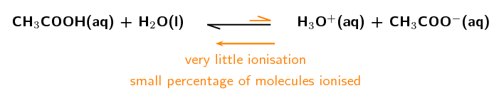 The unequal double arrows in the reaction equation indicate that the equilibrium position favours the formation of ions. This is in contrast to the ionisation of a weak acid.