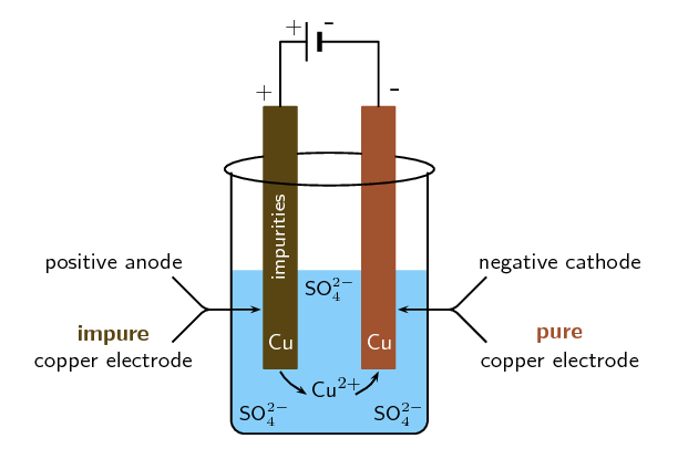 The other metal impurities do not dissolve (\(\text{Au}(\text{s})\), \(\text{Ag}(\text{s})\)) and form a solid sludge at the bottom of the tank or remain in solution (\(\text{Zn}(\text{aq})\), \(\text{Fe}(\text{aq})\) and \(\text{Pb}(\text{aq})\)) in the electrolyte.
