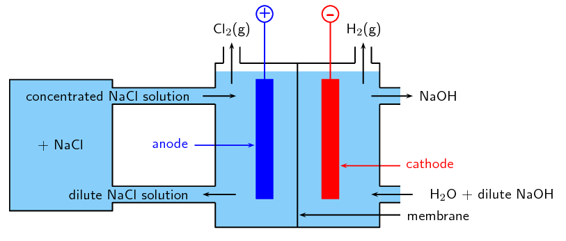 brine is pumped into the anode compartment, and only the \(\color{red}{\text{positively charged}}\) \(\color{red}{\text{sodium ions}}\) pass into the cathode compartment, which contains pure water