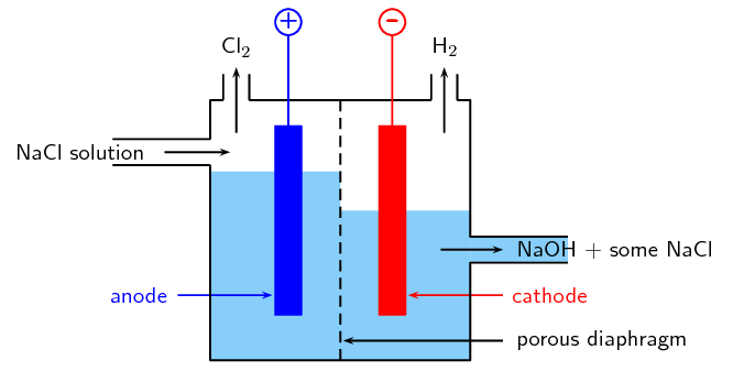To separate the chlorine from the sodium hydroxide, the two half-cells were traditionally separated by a porous asbestos diaphragm, which needed to be replaced every two months.