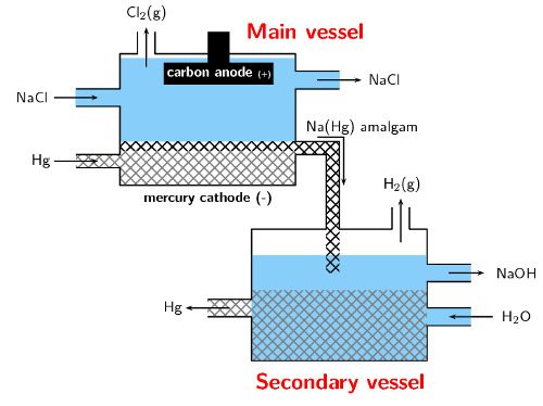In a mercury cell the sodium dissolves in the liquid mercury to form a liquid amalgam of the two metals. This separates the \(\text{Cl}^{-}\) and \(\text{Na}^{+}\) ions.