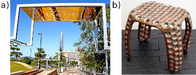 a) An electroplated piece of aluminium artwork and b) a wax stool electroplated in copper.