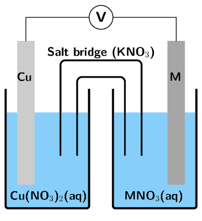 An electrochemical cell is made up of a copper electrode in contact with a copper nitrate solution and an electrode made of an unknown metal \(\text{M}\) in contact with a solution of \(\text{MNO}_{3}\). A salt bridge containing a \(\text{KNO}_{3}\) solution joins the two half-cells. A voltmeter is connected across the electrodes. Under standard conditions the reading on the voltmeter is \(\text{+0,46}\) \(\text{V}\).