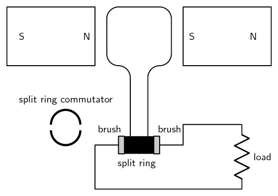 If the current is DC, split-ring commutators are required to create a DC motor. This is shown