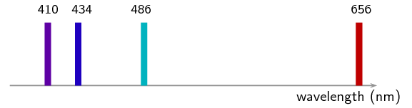 Figure 12.6: Diagram of the emission spectrum of hydrogen in the visible spectrum. Four lines are visible,