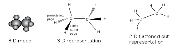 Of course molecules are not two-dimensional so shown below are a few examples of different ways to represent methane (\(\text{CH}_{4}\), Figure 4.9) and ethane (\(\text{C}_{2}\text{H}_{6}\), Figure 4.10).