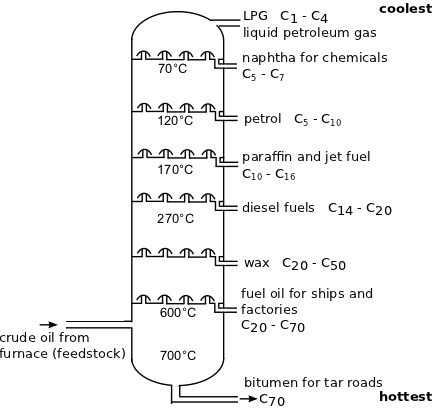 Bitumen for tar roads is collected at the bottom of the fractionating column. These are all