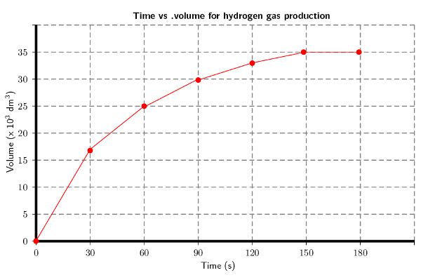 There is a sharp increase in the volume of hydrogen gas produced for the first 120 seconds. This is when the reaction is starting and there are lots of reactants. Between 150 and 180 seconds equilibrium is established and so the volume of hydrogen gas that has been produced remains constant.