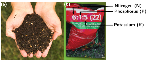 Figure 14.2: Examples of (a) organic (compost) and (b) inorganic (industrially made) fertilisers indicating the NPK ratio that will be discussed later.