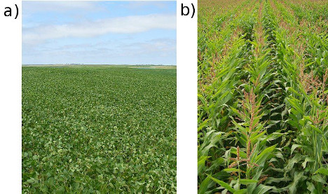 a) A soy bean field and b) a maize field. Crop rotation helps to restore nutrients in the soil.
