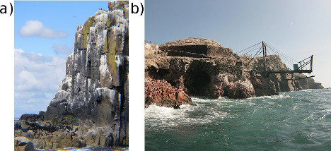 a) A cliff covered in guano and b) a guano mine off the coast of Peru. Guano is the excretion of seabirds, bats and seals.
