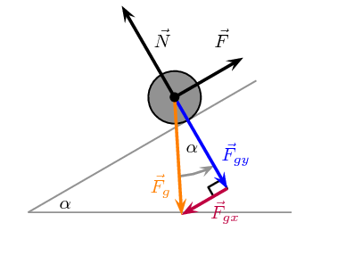 force parallel to the slope is \(\vec{F}_{gx}=\vec{F}_g\sin\alpha\) down the slope.
